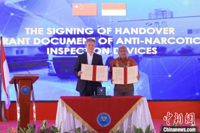 12月6日,中国援印尼毒品检测设备交接仪式举行。中国驻印尼大使王鲁彤和印尼国家禁毒委员会主席马蒂努斯分别代表中印尼两国政府签署了设备交接证书。中新社记者 李志全 摄