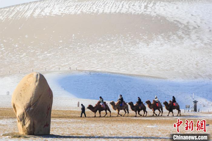 2024年12月10日,甘肃敦煌,游客骑骆驼观赏敦煌大漠雪景。(资料图)王斌银 摄