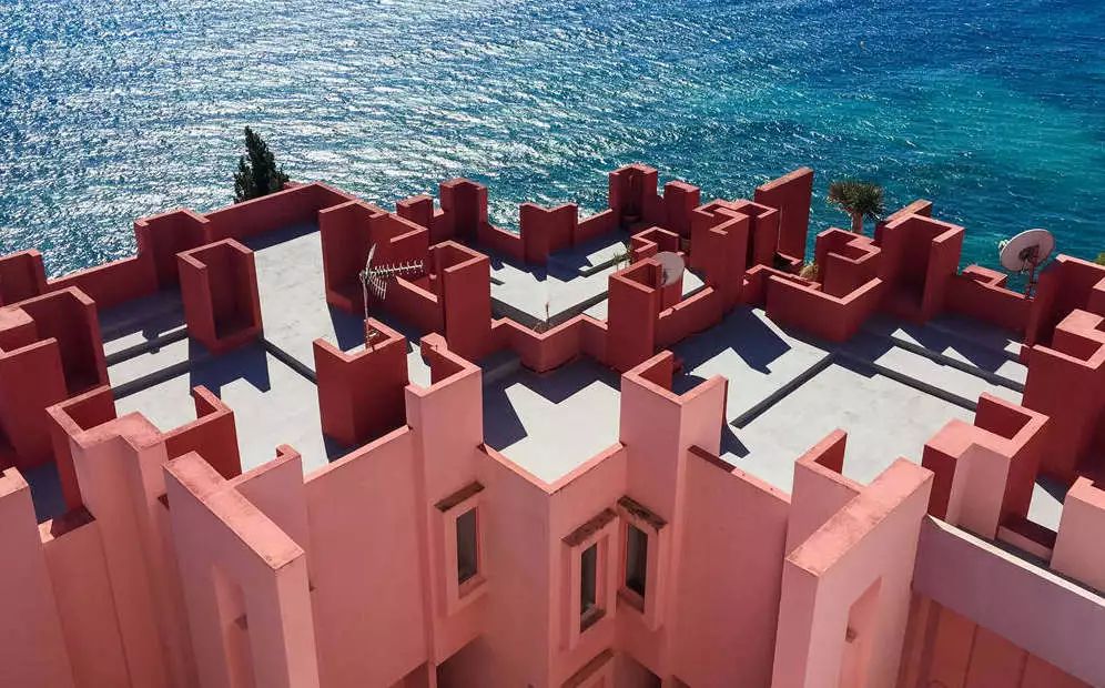 位于西班牙瓦伦西亚自治区卡尔佩海岸的La Muralla Roja,是由著名建筑师Recardo Bofill在1973年所建的住宅项目。在广阔无垠的蓝色地中海海景映衬下,色彩素净又绚烂的墙面、高低组合视觉冲击强力的几何线条建筑,就如同《纪念碑谷》游戏画面一样玄妙而梦幻。