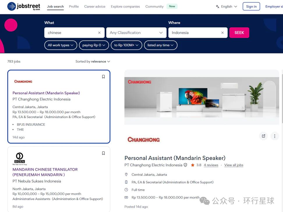 印尼最大求职网站之一的Jobstreet上中文类工作机会很多