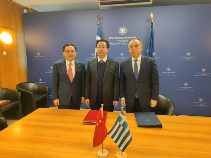 華人華僑 方遒大使出席希腊水产品输华议定书签字仪式 By user - 2025 年 2 月 23 日 2月17日,中国海关总署党委委员、广东分署主任李魁文与希腊农业发展和食品部副部长凯拉斯在雅典签署关于希腊输华野生和养殖水产品的检验检疫和兽医卫生要求议定书。方遒大使出席签字仪式。