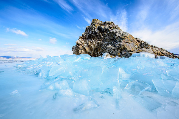 用任何语言来形容被蓝冰所覆盖的贝加尔湖都是贫乏的,人类1/5的淡水被封冻在这片冰蓝之下,站立其上,如浮于一片深不可测的幽蓝之上。在那些岸边的大块岩石周围则形成了大片的冰挂,甚至还形容了冰洞。冰封的湖面并非一平如镜,在很多地方都有大片的起伏,还有一片片如同切割过的玻璃一样的冰片。而最吸引你目光的依然是那长长的白色裂痕,它们深至冰层深处,延伸向无尽的远方,危险而又美丽。
