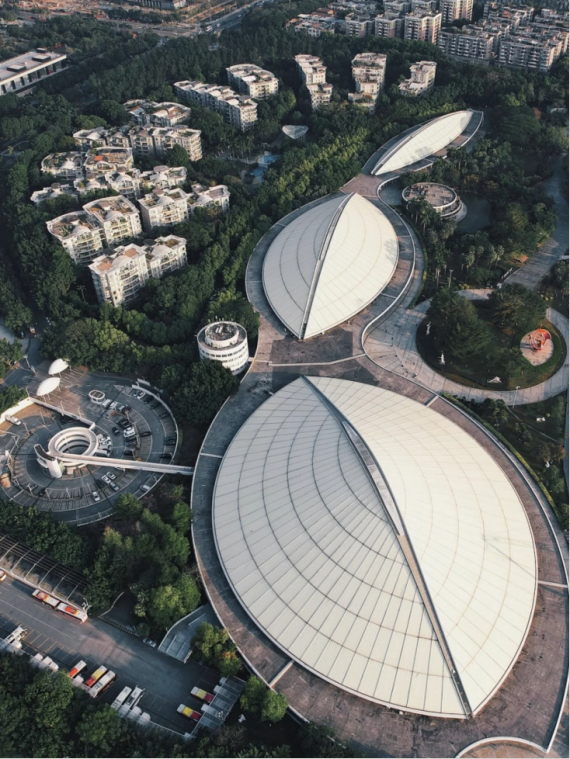建筑师把以人为本和回归自然的设计理念巧妙融合,三个场馆绵延相接,随地势而蜿蜒,尺度宜人,体量谦和隐然,体形简约从容。从高处眺望,屋盖犹如漂浮在白云山下的三朵云,又似三朵蘑菇镶嵌在白云中,浪漫而又别具一格。