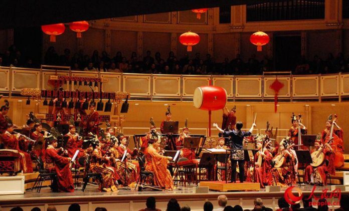 由芝加哥交响乐团组办、中国湖北编钟国乐团及中国国家京剧院一团联合演出的庆祝猪年春节音乐会,当地时间2月10日在芝加哥交响中心举行。应邀出席观看的中国驻美国大使崔天凯说,芝加哥交响乐团和中国有关文艺团体的合作,是一个很好的例证,人民之间的交流和来往,是搞好国与国关系的基础。他在演出后举办的酒会上,赞扬编钟的演奏很好,并建议可以考虑在演出期间放映简要和适当的英文字幕,这样可以帮助美国当地民众对剧情和主题的理解。