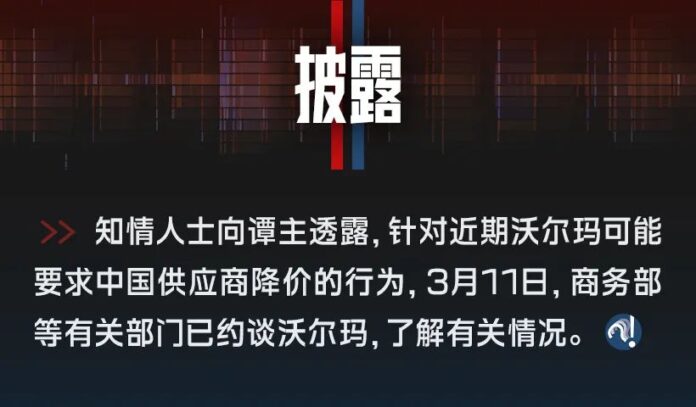 知情人士向谭主透露,针对近期沃尔玛可能要求中国供应商降价的行为,3月11日,商务部等有关部门已约谈沃尔玛,了解有关情况。