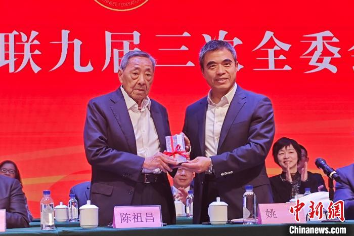 3月13日,泉州市副市长姚飞向旅菲侨领陈祖昌先生赠送“海外咱厝人——陈祖昌先生的故事”专辑。 吴冠标 摄