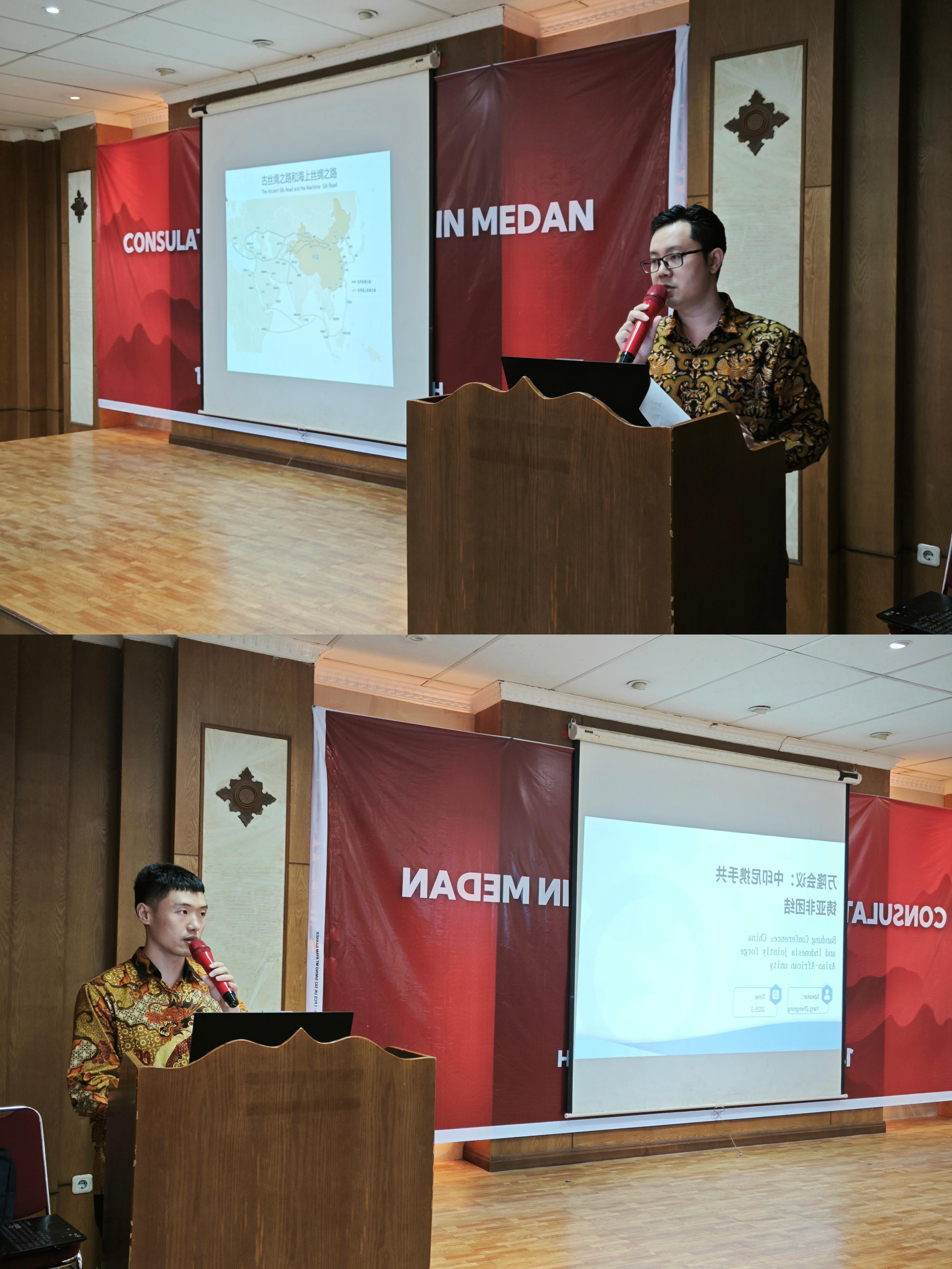 两位青年外交官分别以“一带一路”和万隆会议为主题进行演讲,详细介绍“一带一路”倡议的发展历程和中印尼高质量共建“一带一路”取得的重要成果,深入阐述万隆会议精神对于加强全球南方团结与合作的现实意义。