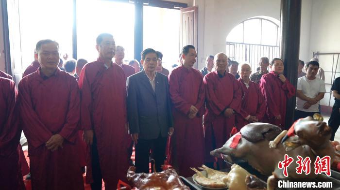 4月3日,海南省文昌市陈氏祖祠内,新加坡海南协会理事长陈学汉(左三)与宗亲一同循古礼祭祖。 陈英清 摄