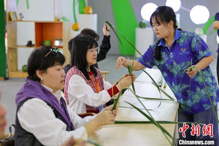 坐在椰树下,参访嘉宾们品尝甘甜的椰子水和脆嫩雪白的椰肉,大快朵颐。在椰子产品展示区,从传统的椰子糖、椰子糕、椰汁等食品,到椰子油护手霜、椰雕工艺品等,充分展示了椰子“全身都是宝”的特质。在椰子科普馆,工作人员展示椰叶编织技艺,椰叶瞬间“变身”小昆虫,吸引不少嘉宾踊跃体验,亲手编织“小蚂蚱”。