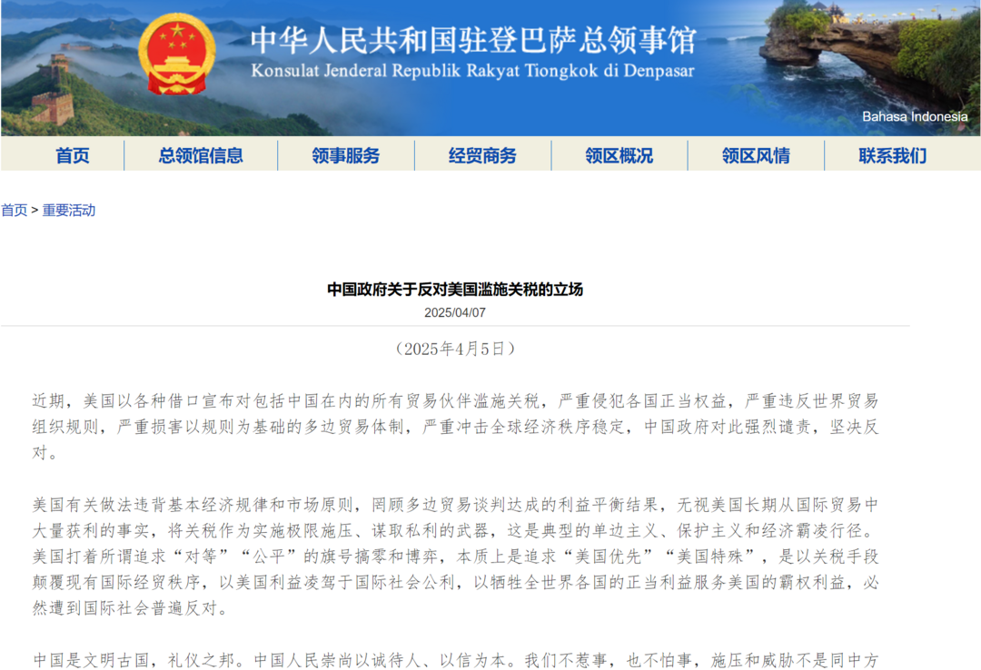 中国驻登巴萨总领馆近日发表题为《中国政府关于反对美国滥施关税的立场》的文章,全文如下: