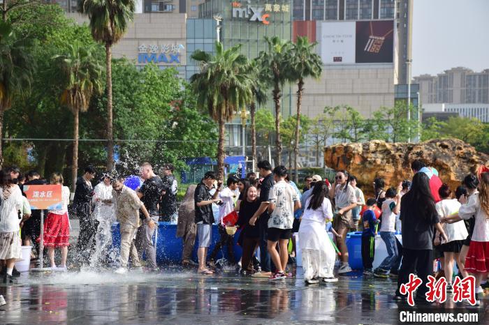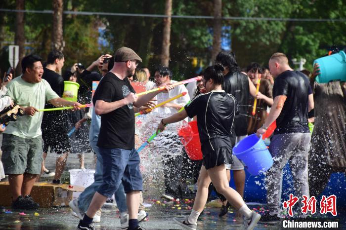在泼水节现场,老挝籍留学生夏雪身穿艳丽服装,脸上涂抹白色粉末,举起水桶向自己的中外同学泼出清凉的“吉祥水”。这是夏雪第二次参加学校举办的泼水节活动,她兴奋地说:“很开心看到这么多国家的朋友喜欢我们的传统活动,朋友们一起泼水,一起跳舞。”