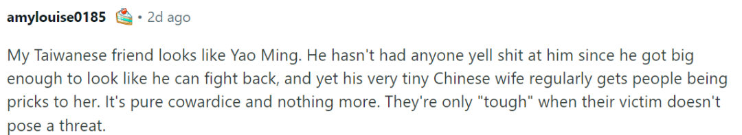 “我的一位来自中国台湾的朋友长得像姚明。自从他长大、看起来能还手之后,就没人敢对他乱喊了。然而,他那个非常瘦小的华人妻子却经常遭人恶语相向。这完全是懦弱的表现,别无他意。他们只有在受害者看起来不构成威胁时才‘强硬’。”