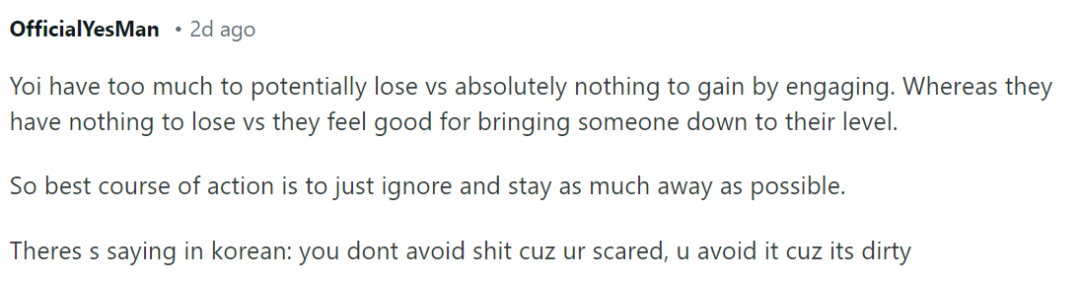 “如果反击的话,你可能会损失太多,而且无法得到什么。而他们没有什么可失去的,反而能通过贬低别人让自己感觉良好。所以最好的做法就是尽量无视并远离这些人。有一句韩语谚语说得好:你避开粪便不是因为你害怕,而是因为它脏。”