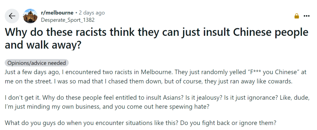 前不久,一位在墨尔本读大一的华人女孩在Reddit上发帖求助,询问遇到种族歧视应该怎么做。
