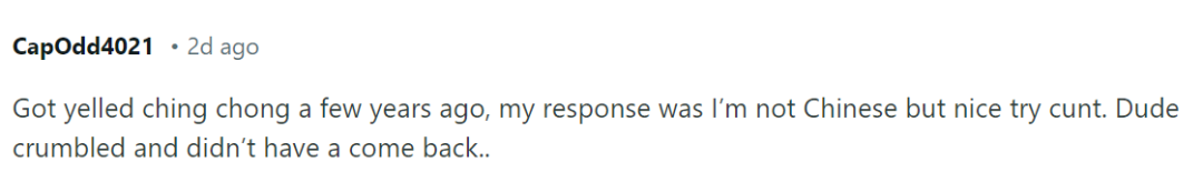 “几年前有人对我大喊‘ching chong’,我回应说我不是中国人,但尝试不错,混蛋。那个人当场傻了,没再回嘴。”