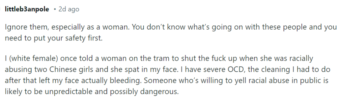 “直接无视,尤其是作为女性。你不知道这些人会做出什么,你首先需要确保自己的安全。我(一名白人女性)曾在电车上让一名女士闭嘴,因为她在种族歧视两个华人女孩,结果她朝我脸上吐了一口唾沫。我有严重的强迫症,之后的清洁让我的脸都流血了。一个愿意在公众场合大声种族歧视他人的人,很可能是不可预测且可能危险的。”