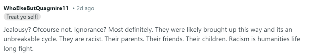 “嫉妒?当然不是。无知?毫无疑问。他们很可能是这样被养大的,这是一个无法打破的循环。他们是种族主义者,他们的父母、他们的朋友、他们的孩子也是。种族主义是人类长期以来的斗争。”