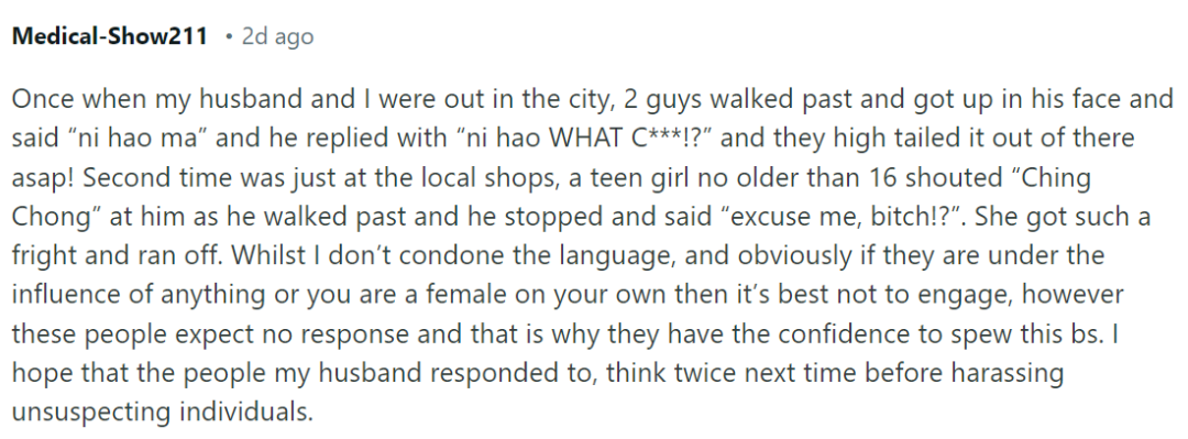 “有一次我和我丈夫去city,两个男人走过来对着他的脸说‘你好吗’,我丈夫回了一句‘你好什么,混蛋!’,他们立刻逃走了。第二次是在当地商店,一个不超过16岁的少女边走边对他大叫‘Ching Chong’,他停下来反问‘你说什么,贱人?’。她被吓得转身就跑。虽然我不赞成这种做法,而且如果他们磕了药,或者你是一个单独的女性,最好不要反击,但这些人就是期望你没有任何反应,这就是他们有勇气说这些废话的原因。我希望被我丈夫反击的那几个人,下次骚扰毫无戒备的人之前能三思。”
