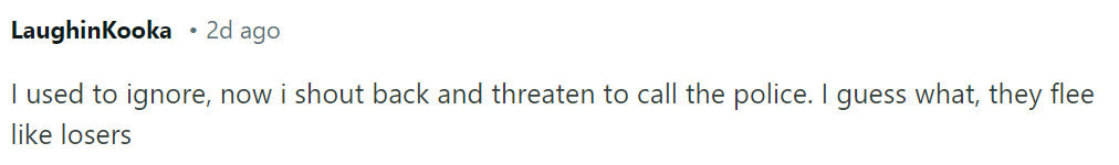 “我以前习惯忽视,现在我会骂回去,并威胁要报警。猜猜怎么着,他们就像失败者一样逃跑。”