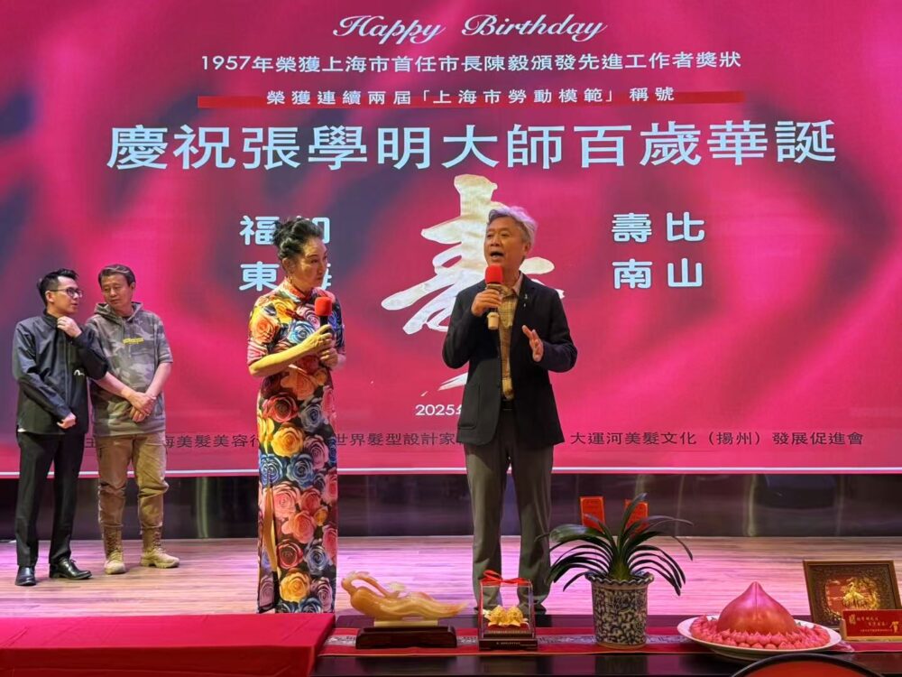 ↑圖:「張學明大師的百年人生,彷彿是一部波瀾壯闊的美髮行業發展史詩。 他以百年如一日的匠心,精心雕琢著每一個髮型,用心書寫著屬於自己的傳奇故事。」上海美髮美容行業協會會長舒建武致詞。