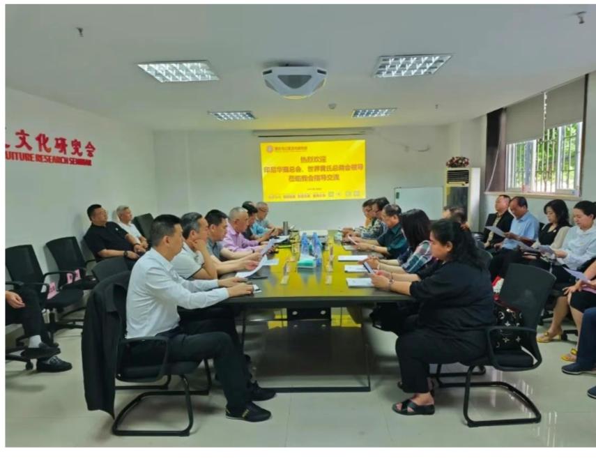 5月9日上午9时许,黄德新率印尼华裔总会副总主席谢富庆先生、印尼华裔总会总财政廖丽华女士、印尼华裔总会廖内群岛省分会荣誉会长拿督 陈瑞海先生、印尼华裔总会妇女协会主席郑媚姐女士、印尼华裔总会广东分会及商贸部主席黄嘉琪女士、世黄总商会秘书长黄栋星先生、广西江夏文化发展研究会监事长黄益斌先生、黄玥女士、世黄总商会副秘书长黄继明先生、佛山青创会副会长黄勇华先生、广东金熊公司主任翁金梅女士、中国五矿化工进出口商会印尼负责人姚辉女士、厦门东晋艺术馆馆长黄冬进一行14人到访重庆市江夏文化研究会。我会会长黄晓旭、执行会长黄国云、李永飞、研究会领导黄昭和、黄光文、黄皓、黄小龙、黄文全,以及研究会各方面负责人黄平、黄书勇、黄德清、黄建俊等参加交流座谈。研究会企业专委会副秘书长黄海龙、黄龙海全程参与会务服务工作。