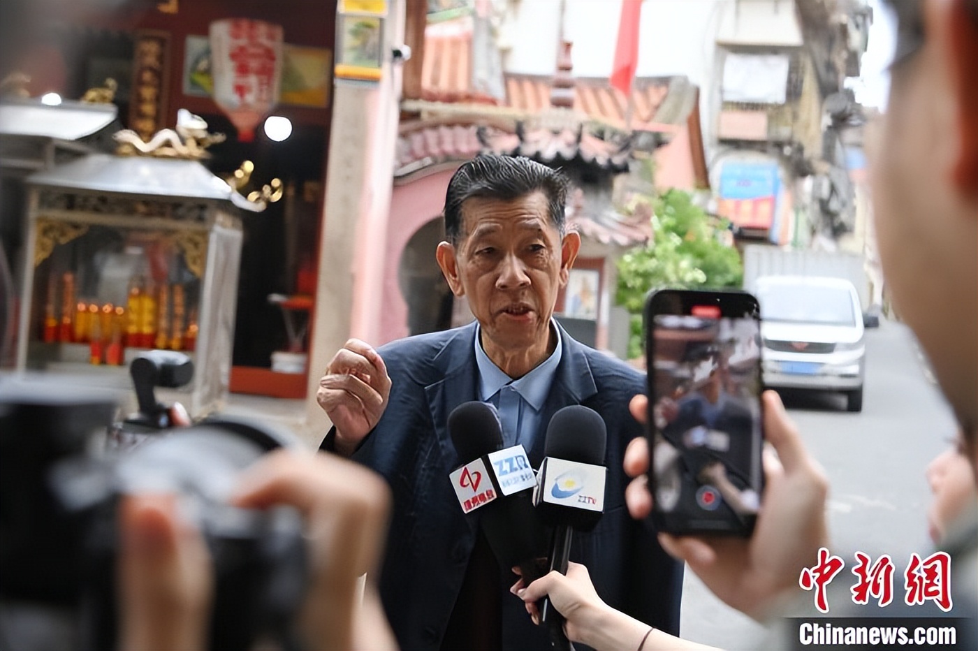 4月27日,福建省漳州市侨史研究专家郑来发在位于芗城区大同路上的塔口庵前,向采访团介绍李林的成长故事。中新网记者 张金川 摄