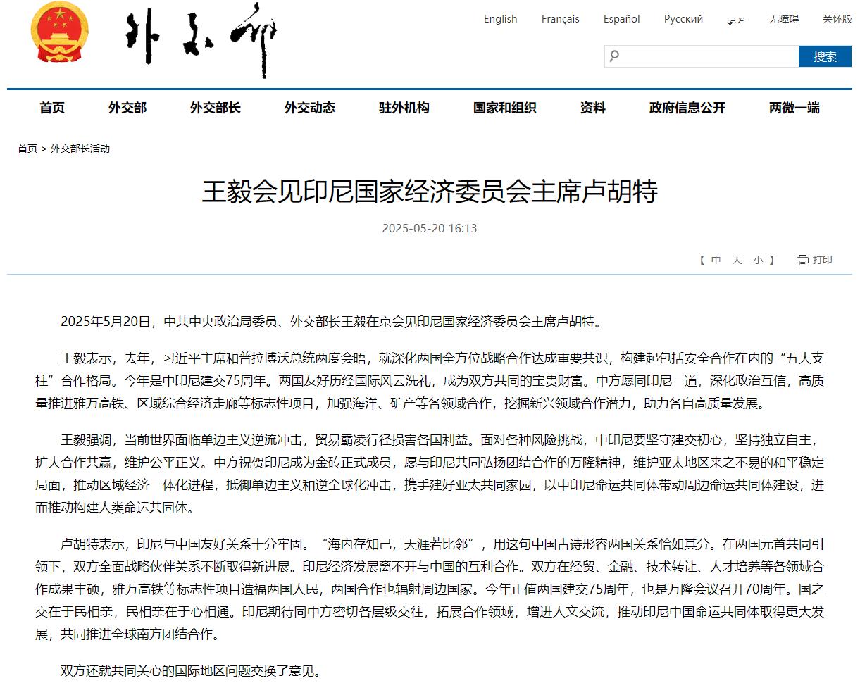 据中国外交部官网消息,5月20日,中共中央政治局委员、外交部长王毅在京会见印尼国家经济委员会主席卢胡特。