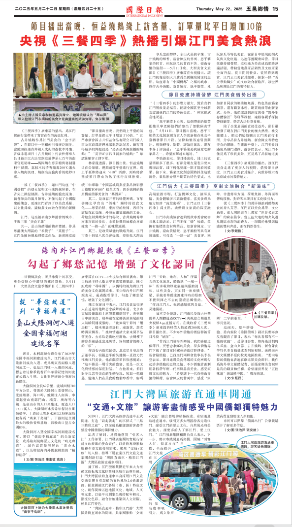 冬瓜盅的醇厚、金山火蒜的辛辣、古井烧鹅的酥香、新会陈皮的甘冽、恩平簕菜的回甘、杜阮凉瓜的甘而不苦、台山青蟹的清甜……5月11日晚,大型美食文旅节目《三餐四季》广东篇在央视播出,让江门的灶台烟火升腾为全国观众关注的焦点。这座素有“中国侨都”之称的城市,凭借古井烧鹅、新会陈皮、恩平簕菜、杜阮凉瓜等特色美食,在节目中展现的烟火气与文化底蕴,迅速俘获观众味蕾。节目效应持续发酵,这些地方美食成为网络热议话题,带动当地农产品销售及文旅产业全面升温。从田间到餐桌,从屏幕到现实,江门正以美食为纽带,探索一条“舌尖带动脚尖”的文旅融合新路径,让世界品味湾区江门的独特魅力。