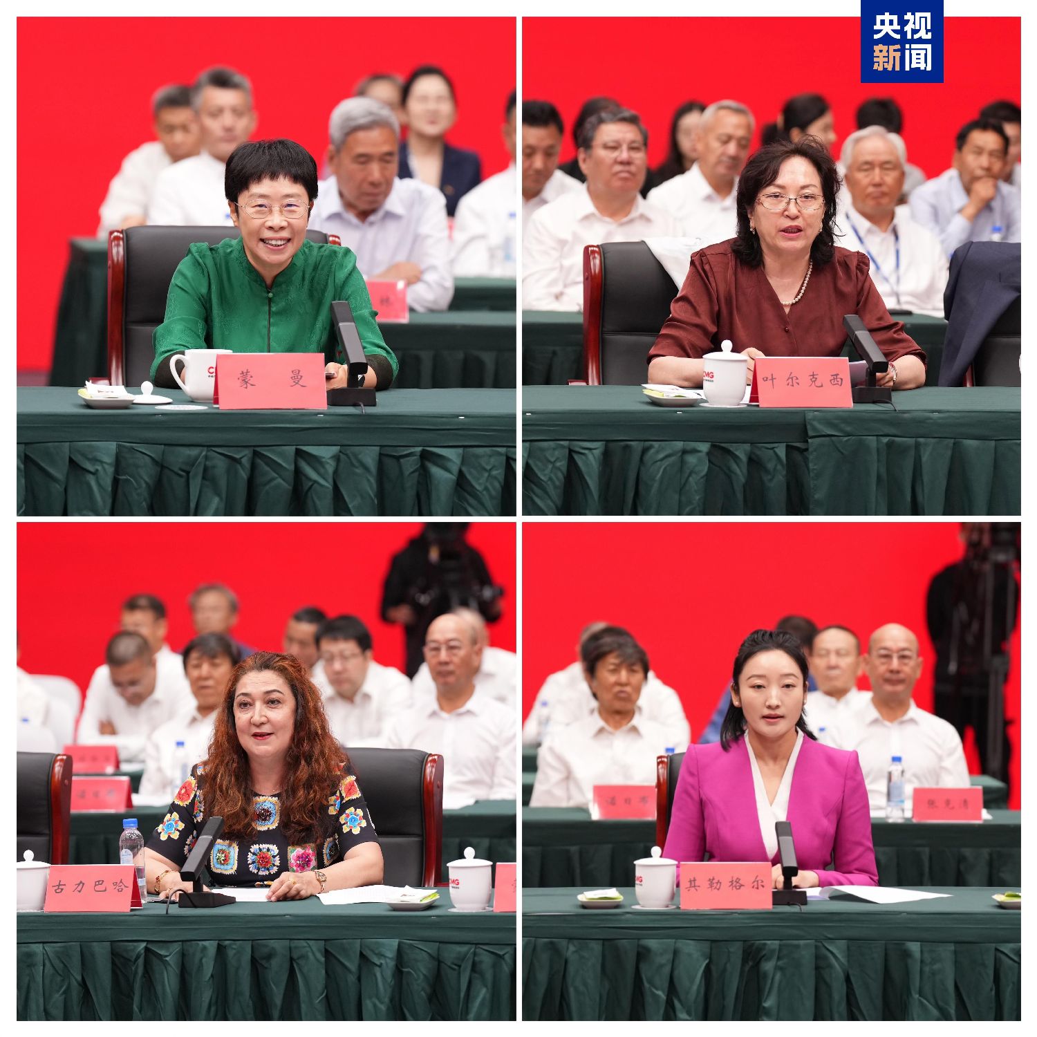 △中央民族大学历史文化学院教授蒙曼,哈萨克语节目听友代表、著名作家叶尔克西·胡尔曼别克,民族语言节目离退休老同志代表古力巴哈,青年员工代表其勒格尔在会上座谈交流