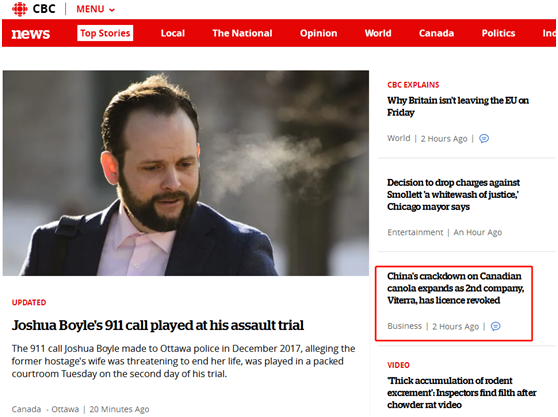 “中国取消第二家加拿大油菜籽公司出口中国的许可证!”加拿大广播公司(CBC)26日在其官网的醒目位置刊登了这一消息,并称此举将对“加拿大油菜籽出口造成重大打击”。就在本月1日,中国海关总署取消一家加拿大公司对华出口油菜籽的资格,外交部发言人陆慷6日曾就此回应称,“中国政府做出上述决定当然有根有据”。