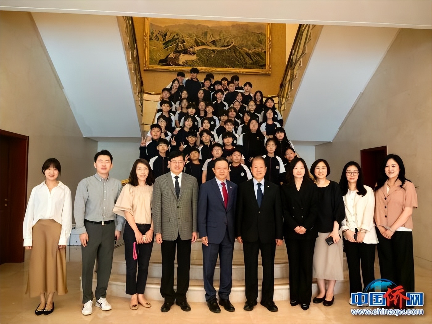 5月23日,韩国汉城华侨小学六年级毕业生及教师一行走进中国驻韩国大使馆参观交流。图为活动合影。中国驻韩国大使馆领侨处 供图
