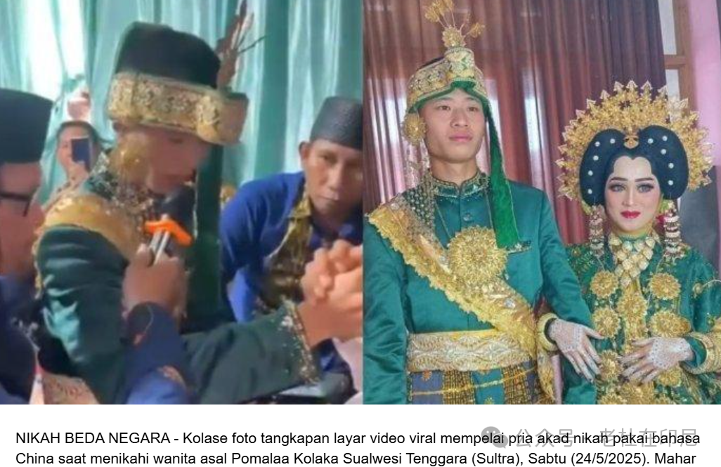 婚礼于2025年5月24日在东南苏拉威西省科拉卡县坡马拉区哈卡图托布村举行。视频显示,这对新人的结婚仪式按照穆斯林传统进行,期间,新郎使用中文进行宣读。