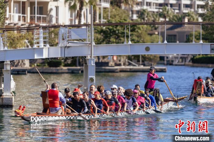 近日,由南非开普敦华人社区和开普敦龙舟协会主办的龙舟节在开普敦维多利亚港举行,图为龙舟赛现场。(受访者供图)