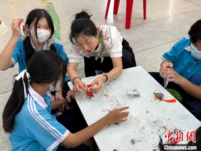 5月30日,泰国曼谷培知公学华文教师张婷指导学生制作香囊。(受访者 供图)