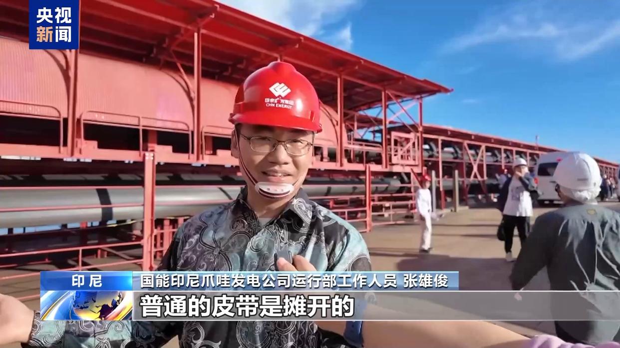 国能印尼爪哇发电公司运行部工作人员 张雄俊:普通的皮带是摊开的,但你看,我们这有3.6公里长的(管状)皮带,我们是管带机,那就是为了环保。