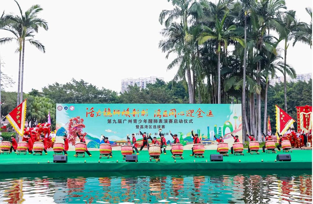 6月2日,第九届广州青少年醒狮表演赛在荔湾湖公园水上舞台火热开赛!启动仪式上,56位来自粤港澳大湾区的学子舞动28头醒狮,摆出“十五”字样,象征着56个民族紧密团结,共同迎接“十五运”的到来。