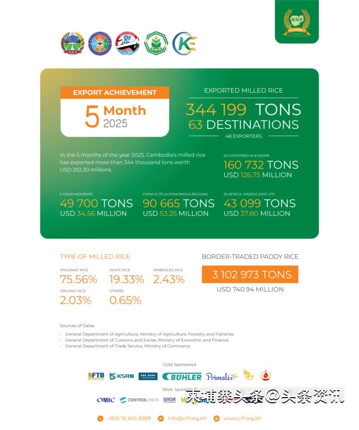 据柬埔寨稻米联盟于2025年6月4日发布的公告,今年前五个月(1月至5月),柬埔寨累计出口大米344,199吨,出口额达2.523亿美元;同期出口稻谷3,102,973吨,出口额达7.409亿美元,两项合计出口额接近10亿美元。
