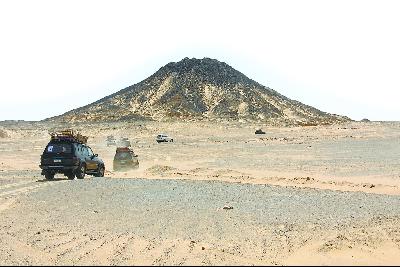 天色微亮,记者便乘车驶离开罗,向其西南方向约360公里的拜哈里耶绿洲进发。这里是黑白沙漠的门户,也是茫茫大漠中人类难得的“世外桃源”。补充完充足的饮用水、食物和燃料,八辆丰田巡洋舰组成的浩浩荡荡的车队便向瑰丽的“外星球”飞驰。