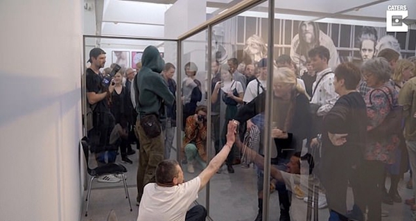 展出刚开始的时候看上去有些吓人,观众起初只敢站在橱窗几米远的地方,但半个小时后,他们就放松了下来,开始与橱窗里的流浪汉互动了。