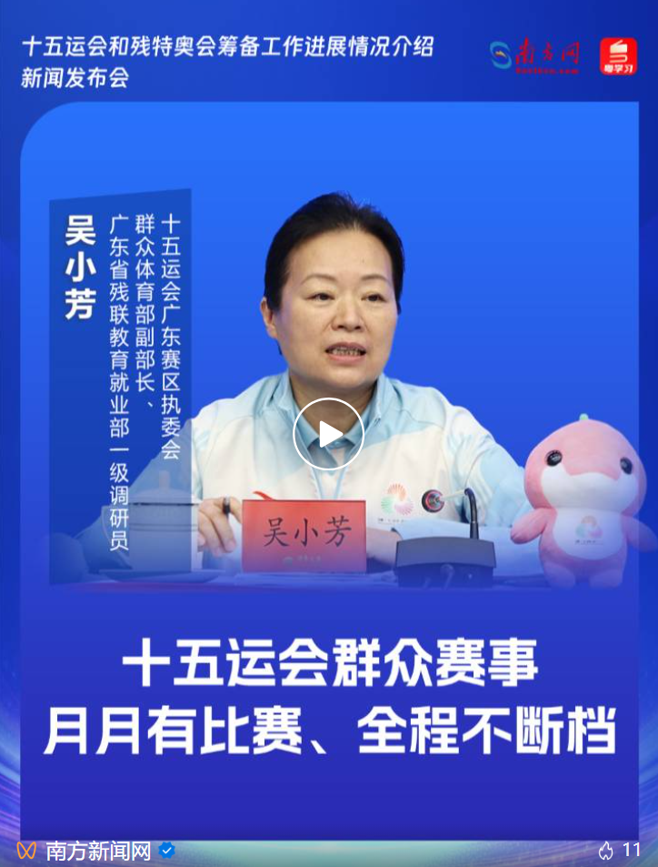 十五运会广东赛区执委会群众体育部副部长、广东省残联教育就业部一级调研员吴小芳表示,十五运会群众赛事活动后续将开展22个大项、153个小项的赛事,其中广东赛区承办20个大项、139个小项,香港赛区负责保龄球1个大项、6个小项,澳门赛区承担空手道1个大项、8个小项。7月将进行足球、龙舟等4个项目,8月开展沙滩足球、乒乓球等6个项目,9月举办篮球、象棋等6个项目,10月安排航空模型、轮滑等5个项目,11月则有桥牌、空手道等5个项目,实现“月月有比赛、全程不断档”。