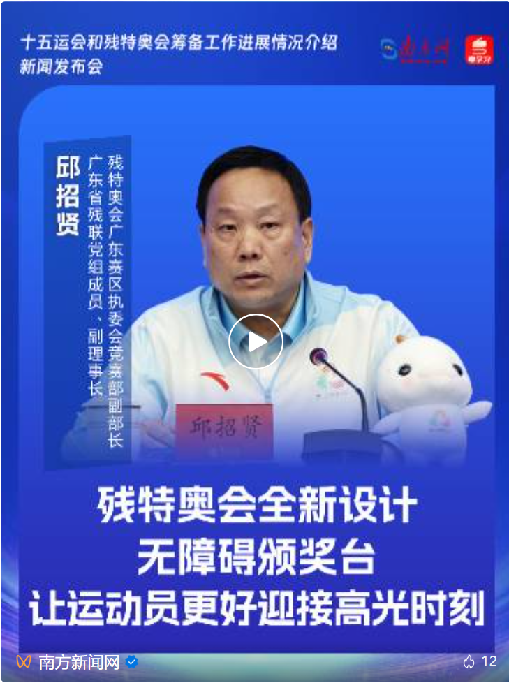 残特奥会广东赛区执委会竞赛部副部长,广东省残联党组成员、副理事长邱招贤表示,筹备工作全方位落实无障碍服务。按“国标、节俭、够用”原则,结合场馆改造,为运动员规划无障碍流线,设置爱心座位;交通、入住、餐饮环节分别配备无障碍车辆、客房、餐厅,保障参赛全程无障碍。借助语音播报系统为视障人士传递赛事信息,媒体转播配备手语解说与实时字幕;服务流程持续优化,专业手语翻译24小时待命,确保残障人士平等享受服务。同时,全新设计的无障碍颁奖台极具巧思,两侧增设斜坡,采用“水平台面+立体标识”,搭配专业引导员全程服务,让运动员自信登上领奖台。