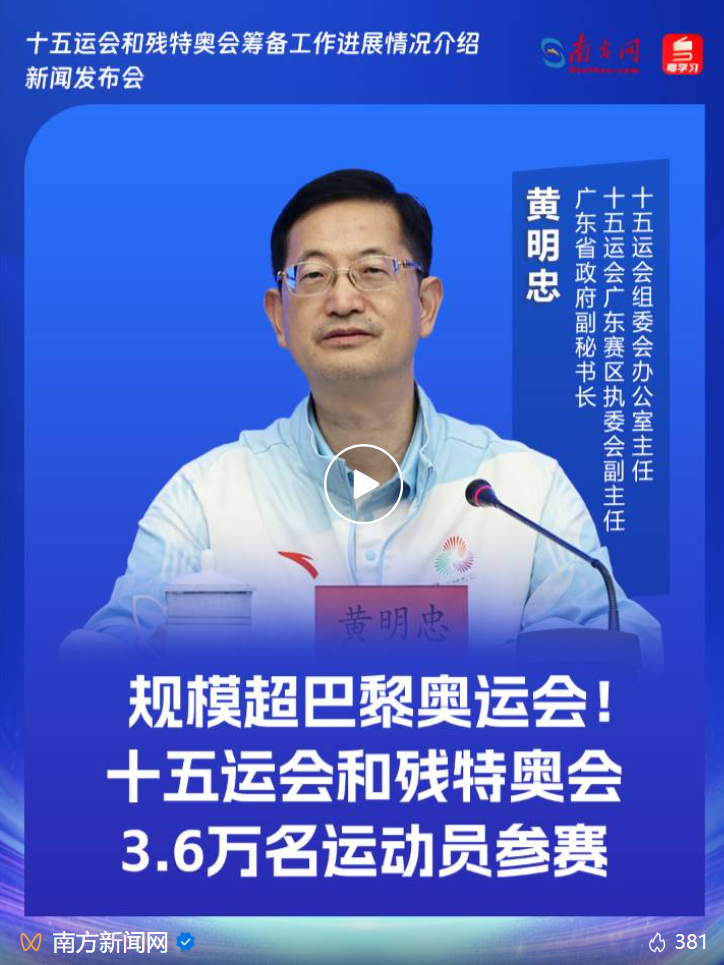 十五运会组委会办公室主任、十五运会省执委会副主任、省政府副秘书长黄明忠介绍,本届全运会和残特奥会呈现“新”“大”“多”三个特点。赛事由粤港澳三地共同承办,开、闭幕式分在广州和深圳举办,在智慧化场馆、绿色办赛、简约办赛等方面有创新举措,还建立了常态化协调沟通机制。预计有3.6万名运动员、4.5万名赛会志愿者、4000名记者参与。设十五运会57大项、残特奥会46大项,规模超2024年巴黎奥运会,部分项目竞技水平世界顶尖。不建集中的全运村,19个城市办赛,大家可体验多地特色。