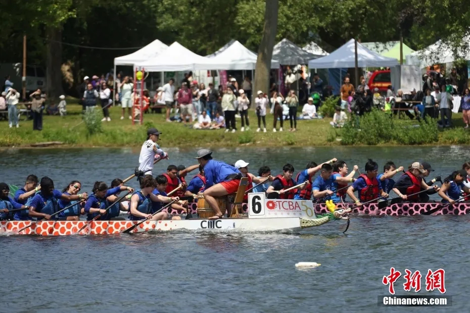 当地时间6月14日,加拿大多伦多中央岛,第37届多伦多国际龙舟节龙舟赛参赛队伍在比赛中挥桨竞渡。本届国际龙舟节由多伦多华商会主办,为期两天,吸引来自世界各地的百余支龙舟队参赛,同时设有多种文化展示活动,预计可吸引逾8万人次游客。(中新社记者 余瑞冬摄)