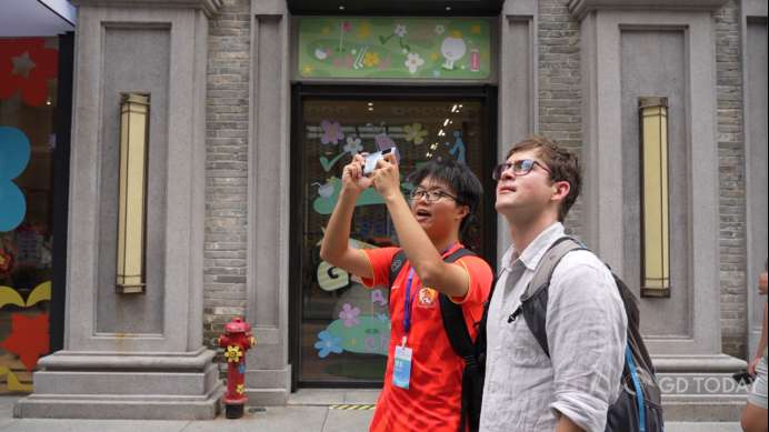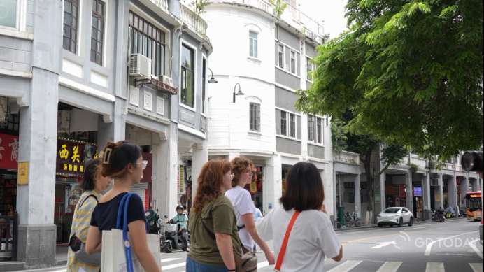 Students view Lingnan architecture during their trip in Liwan District, Guangzhou.
