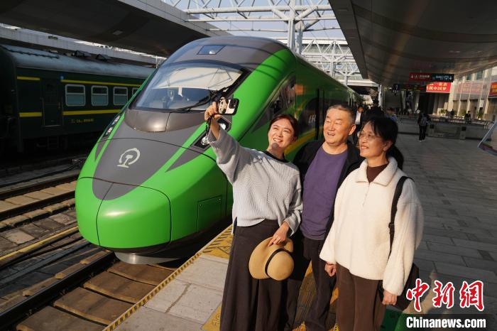 3月28日,中老铁路第5000万名旅客孙怡薇一家在列车前合影。中新社记者 刘冉阳 摄