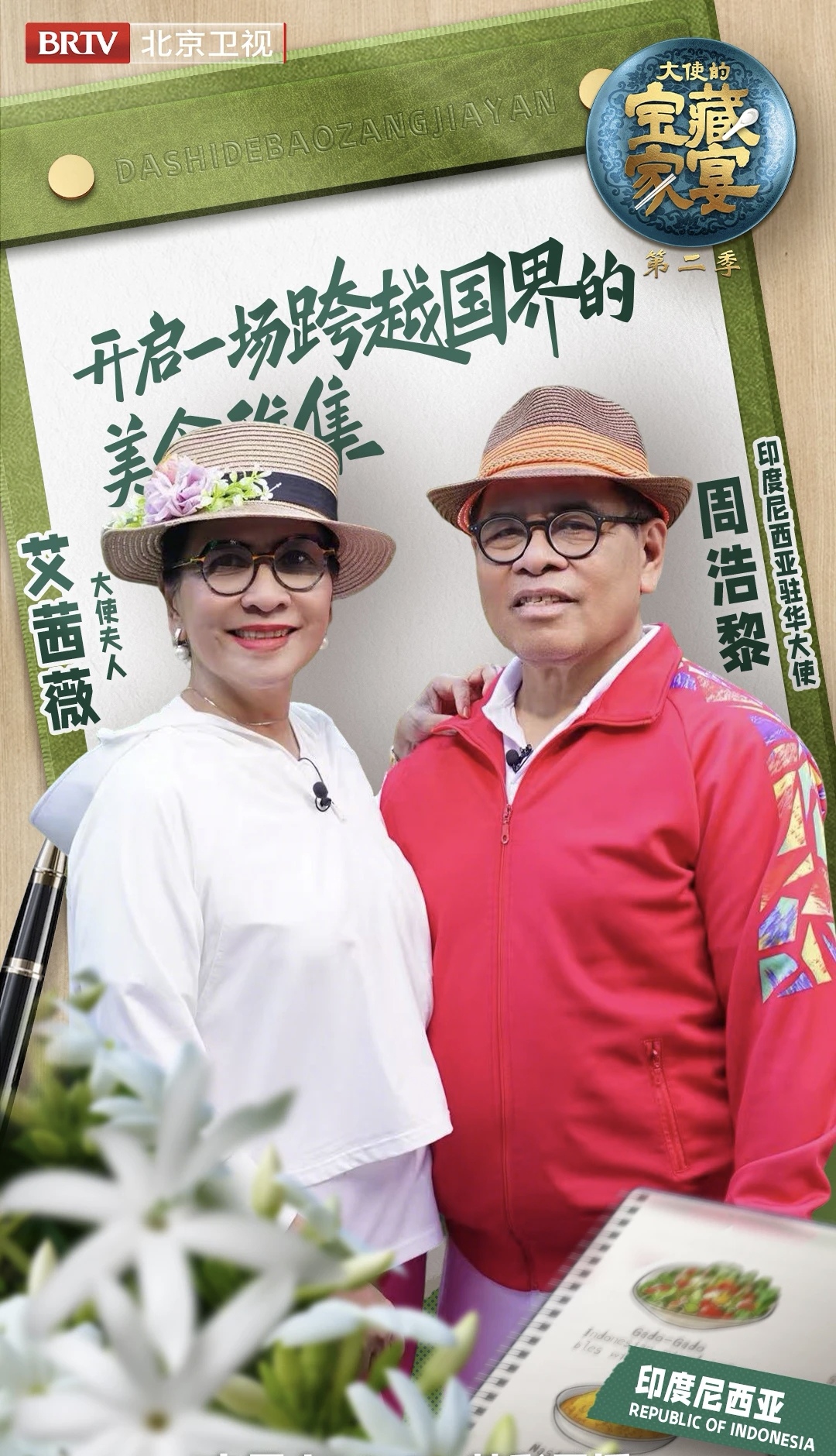 6月28日,北京卫视中外美食文化交流节目《大使的宝藏家宴》第四期印尼篇播出,节目以运河夜色为幕,开启了一场跨越七十五载的中国、印尼友谊之旅。主理团踏进印度尼西亚驻华大使馆,热情的托托舞点燃现场氛围,周浩黎大使亲手为来宾佩戴友谊围巾。
