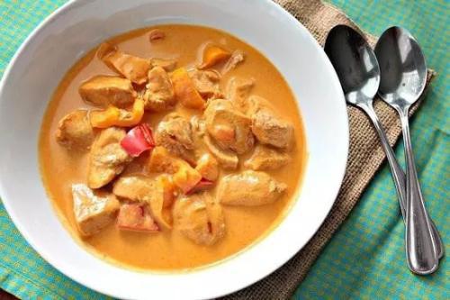 鸡肉咖喱制作较为复杂,耗时长,因此我们首先学习的就是这道菜。先将鸡肉切成块,差不多两口一块的大小,然后将切成片的洋葱、蒜、两整只红绿尖椒、少许咖喱叶、两勺油放入锅中,这一点很像中国人的炸锅。然后放入一勺炒过的黄咖喱粉和五种调料混制的咖喱,再放入少许切碎的番茄、六大勺辣椒面,所有东西都放进去翻炒一小会,然后把鸡肉放进锅中炒,倒入现制的椰奶盖上盖子焖烧。