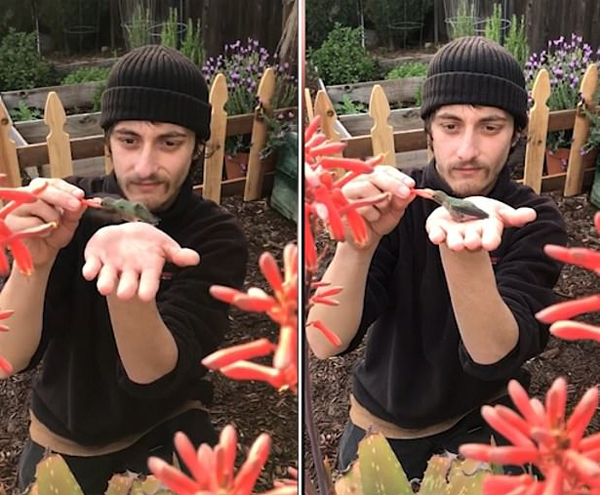 这位名叫布伦特(Brent)的野生动物爱好者用镜头捕捉到了这只蜂鸟停在他手上,从一朵花中吮吸花蜜的瞬间。首先,这只小鸟停在一株亮粉色植物的茎上。它以惊人的速度扇动着小翅膀,盘旋着,似乎在从鲜艳的花朵中吸取花蜜。这个男子被这只小动物迷住了,慢慢地将手掌放在这只蜂鸟下面,很快,小鸟停止了拍打翅膀,靠在他的手心。最后,布伦特对着镜头微笑,而这只蜂鸟继续“坐”在他的手掌上。