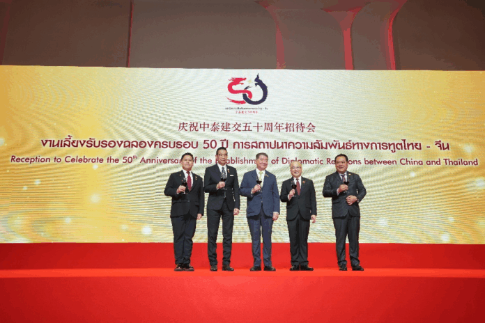 2025年6月30日,驻泰国使馆临时代办吴志武与泰国外长玛里在曼谷共同举行庆祝中泰建交50周年招待会。泰国副总理兼防长普坦、司法部长塔威、社会发展与人类安全部长瓦拉乌、商业部长披猜、工业部长艾格纳,中国侨商联合会会长谢国民,泰国中华总商会主席林楚钦,泰国潮州会馆主席徐惠深,以及各国驻泰使节、中资机构及留学生代表2000余人出席。