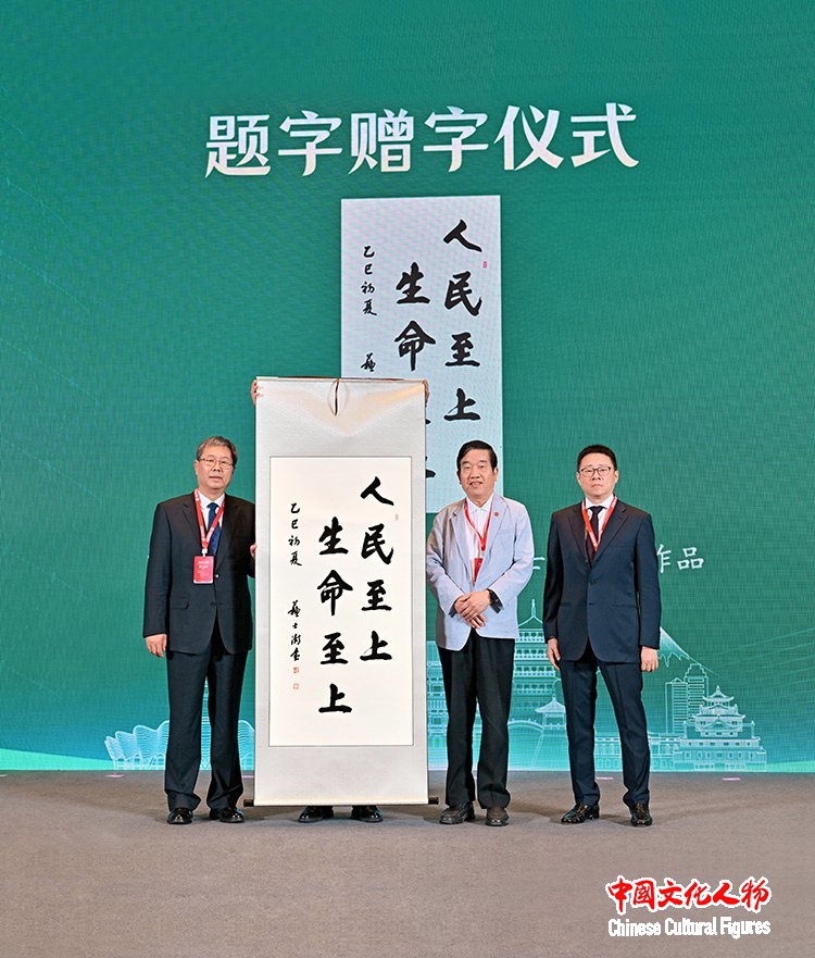 第十一届、十二届全国政协常委、中央文史馆馆员、中国书法家协会名誉主席苏士澍向西安国医医院馈赠书法精品“生命至上 人民至上”匾额,中国国际康养科技学会会长、西安国医医院理事长周湛东,西安国医医院院长党明海接受馈赠并合影留念